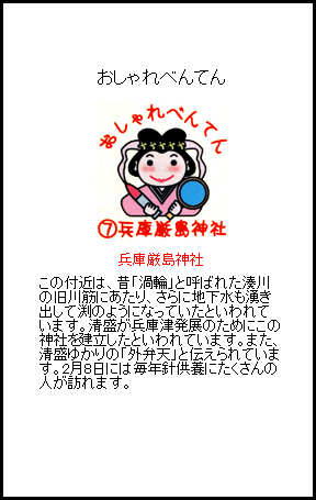 1180年(承安4)に清盛は安芸国の厳島神社を勧請し、このとき宮島にある七つの海岸にちなみ、兵庫に七つの辨財天をお祀りしたのがはじまりです 。